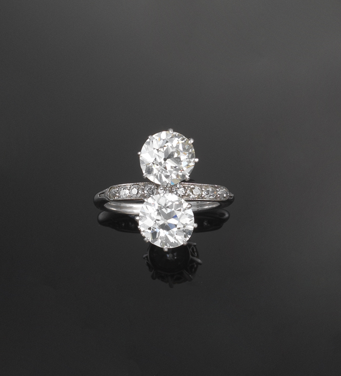 An Edwardian diamond two stone ring, the two old round brilliant cut diamonds weigh approximately 2.50 and 2.60cts each. Set in platinum with nine smaller diamonds. The shank expands from Q-T. Accompanied with certificate number E122151577 from E.D.R dated 21st August 2012 stating that the old european cut diamond weighs 2.56cts with J colour and VVS2 clarity. Also accompanied with certificate number E1212151574 from E.D.R dated 21st August 2012 stating that the old european cut weighs 2.61cts with J colour and VS1 clarity.