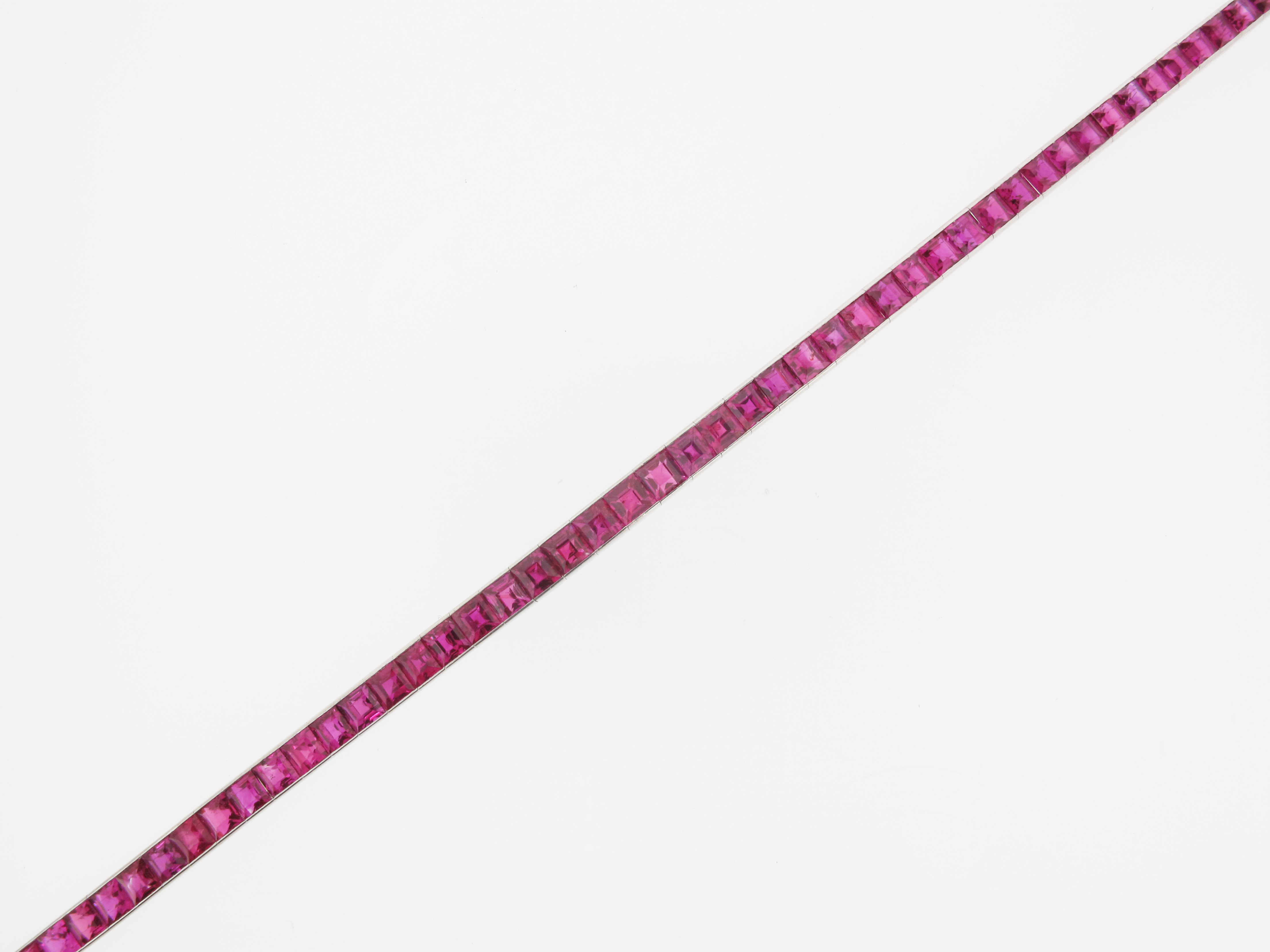 A fine ruby line bracelet, the square rubies are set in flexible platinum links. 18cm.