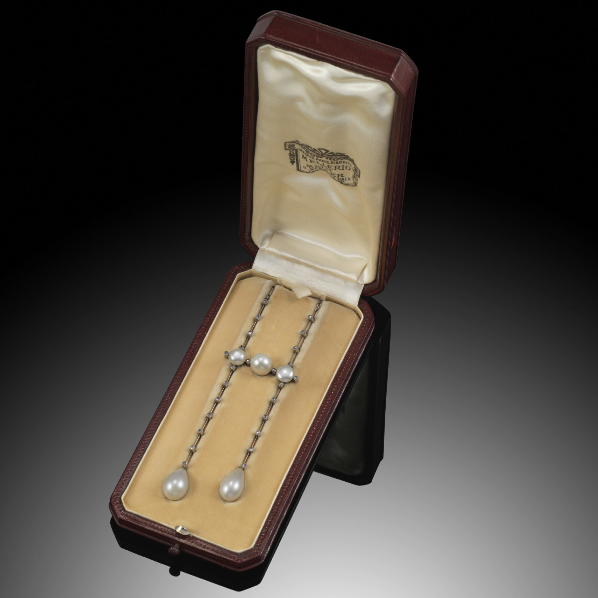 An early 20th Century pearl and diamond lavalier necklace, the two drop shaped pearls suspend from platinum knife edge articulated lines of small millegrain set diamonds. The centre section set with a pearl and two button shaped pearls on a fine link platinum neck chain. Fitted case by Mellerio. French control marks to the clasp ring. Accompanied with report number 64117 dated 13th July 2012 from SSEF stating the the largest button shaped pearl weighs 4.806cts and is a natural saltwater pearl. And accompanied with report number 64116 dated 13th July 2012 from SSEF stating that the two drop-shaped pearls weigh 9.217 and 8.158cts and are both natural saltwater pearls. Provenance: Owned by the Count and Countess Stanislas d'Orsetti, Angers, France and then by descent to the current owner.
