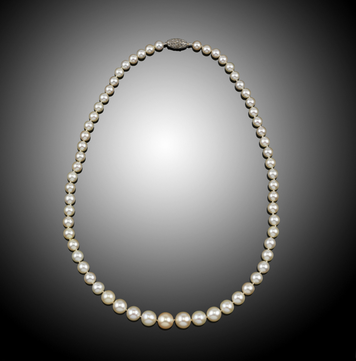 A fine pearl necklace, the single row graduated pearl necklace is 43cm with a simple barrel shaped clasp set with graduated rose cut diamonds. Accompanied with certificate number 64321 from SSEF dated 6th August 2012 stating that the 63 graduated pearls are natural saltwater with slightly cream to cream and partly rosé overtones. Total weight 26.6g (including clasp)