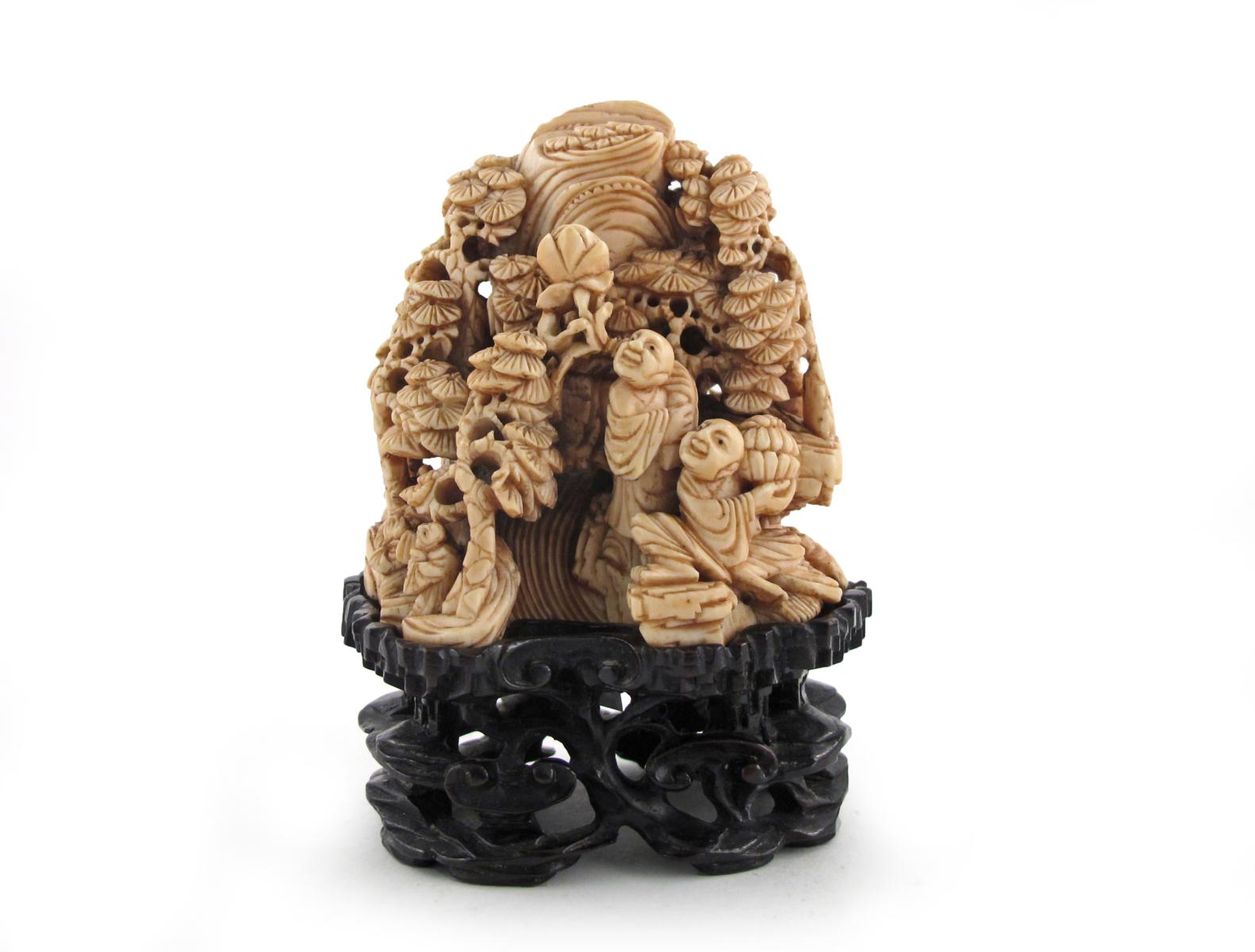 A Chinese ivory carving 19th century, depicting two large figures and several smaller beneath tall pine trees and a rocky outcrop, the reverse with two monkeys and pagodas, together with a reticulated wood stand, damage to the stand, 9cm. (2)
