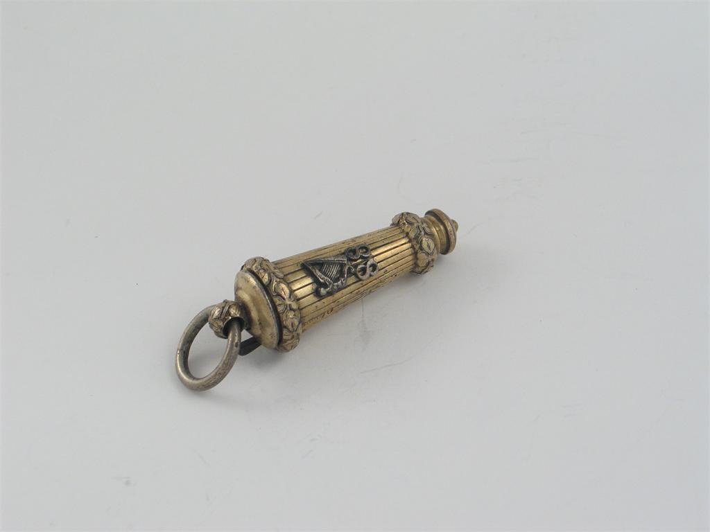 Military Interest: A rare George III silvergilt military whistle, decorated with reeding and shamrock borders, with the applied badge of the 88th Regiment of Foot, Connaught Rangers, by Daniel Harmonas Dawes, London 1827, 2.3in (6cm) long, 1oz.