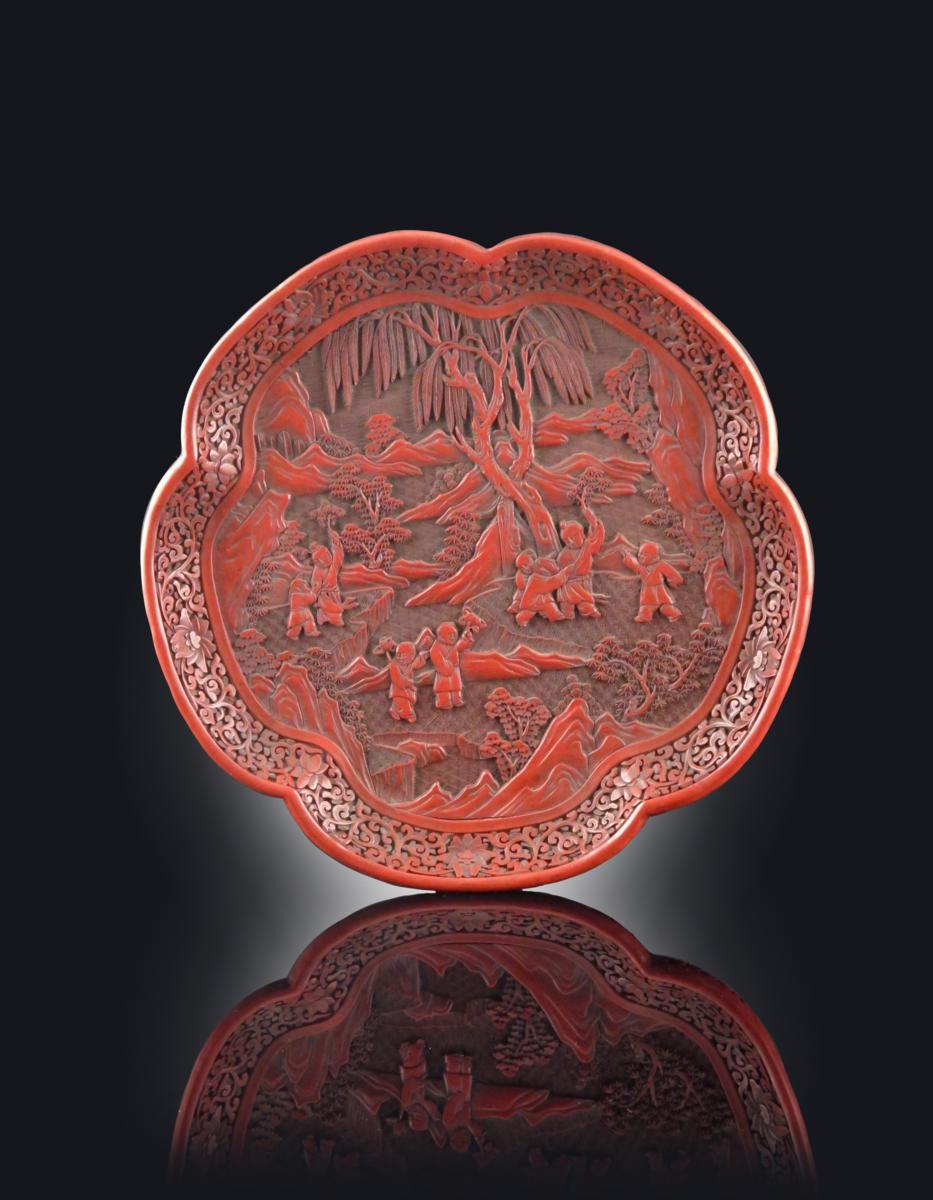 A Chinese red cinnabar lacquer lobed dish 16th century, raised on a high foot and carved with eight young boys playing in a rocky, mountainous landscape beneath pine and willow trees within a continuous border of scrolling foliage, the reverse lacquered black, 32cm. Provenance: acquired c.1957 by the current owner's parents whilst stationed at The British Embassy in Beijing.