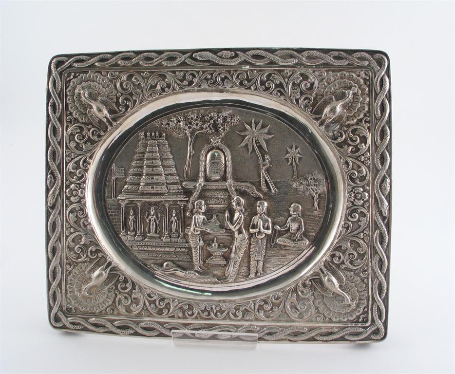 An interesting late 19th/early 20th century Burmese embossed tray, with a central scene depicting figures and deities making an offering before a temple and shrine, flanked in each corner by a peacock, within a border of serpents, on grotesque mask bracket feet, c.1900, 11in (28cm) wide, 16.5oz.