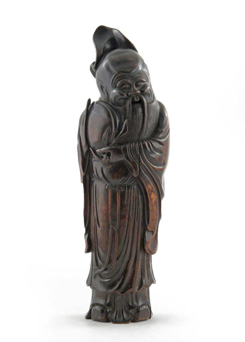 A large Chinese bamboo carving of Shoulao 19th century, standing wearing long flowing robes, carrying a large peach in his arms, 53.5cm.