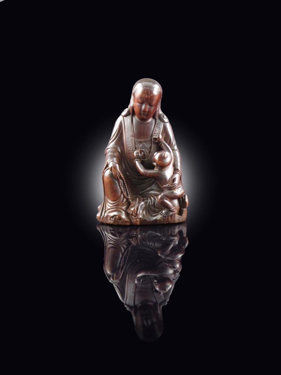 A Chinese hardwood carving of Guanyin 18th century, seated, wearing flowing robes, delicately carved with ornate geometric borders, her right hand holding a rosary, a child clambering upon her lap, the wood with a warm nut-brown patina, some splits to the timber, 10.2cm.