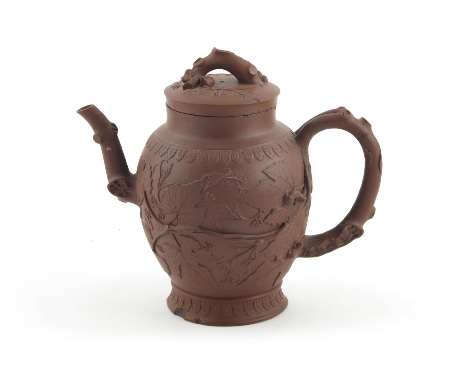 A very large Chinese Yixing teapot and cover 18th century, applied with fruiting vine leaves amidst which squirrels clamber, the handle, spout and finial formed as gnarled branches, extensive chipping, 26.5cm. (2) Provenance: Gunton Park, Norfolk, purchased in the 1980s.