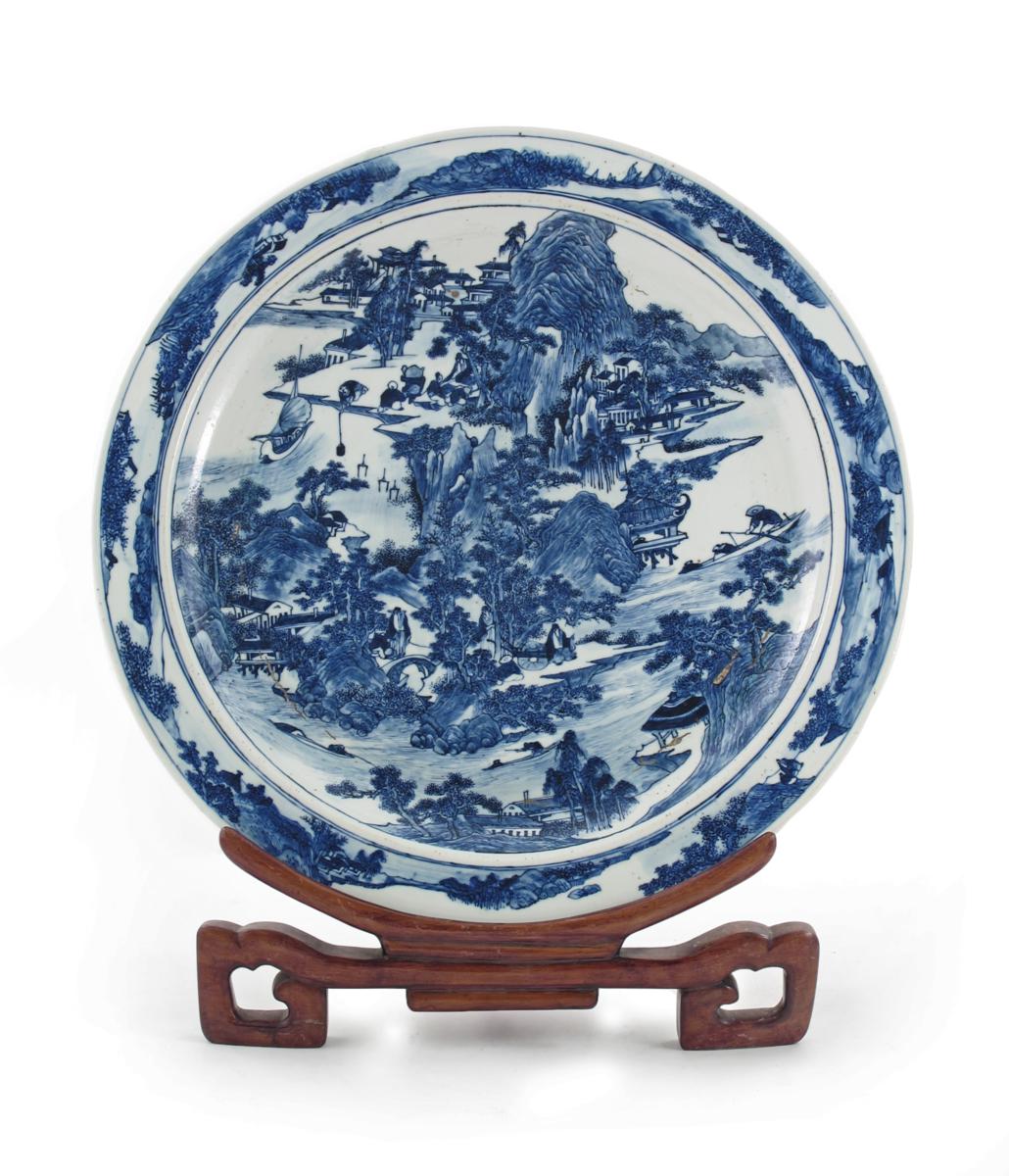 A massive Chinese blue and white Master of The Rocks charger 19th century, depicting a watery, mountainous landscape with pagodas and pavilions, and figures in boats and beneath trees, with a hardwood stand and fitted box, faults to the glaze, 55.2cm. (2) Provenance: the Reverend Victor Farmer collection, 1898-1977.