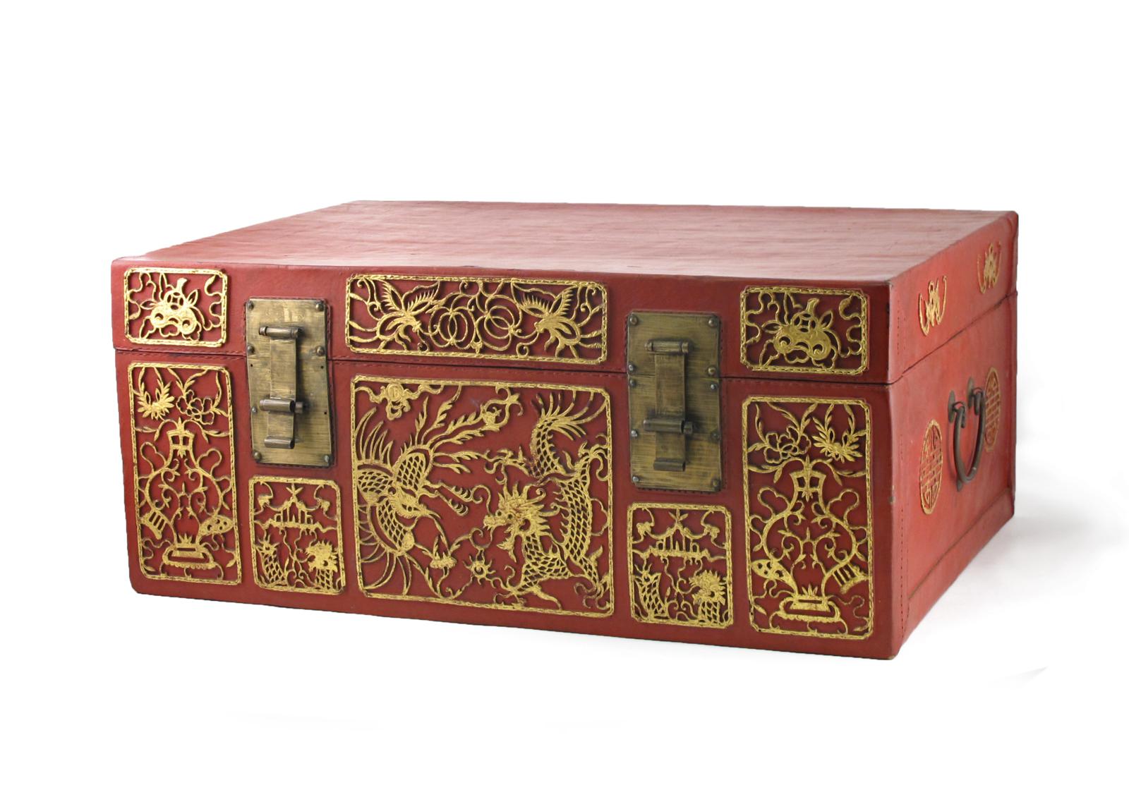 A Chinese red leather and gilt-decorated chest late 19th century, the front in relief with panels of dragons, phoenix, butterflies and other motifs, the sides with brass carrying handles and with shou and bat motifs, together with an original canvas covering, inscribed paper label to the interior, 80cm x 56cm. Provenance: the Reverend Victor Farmer collection, 1898-1977.