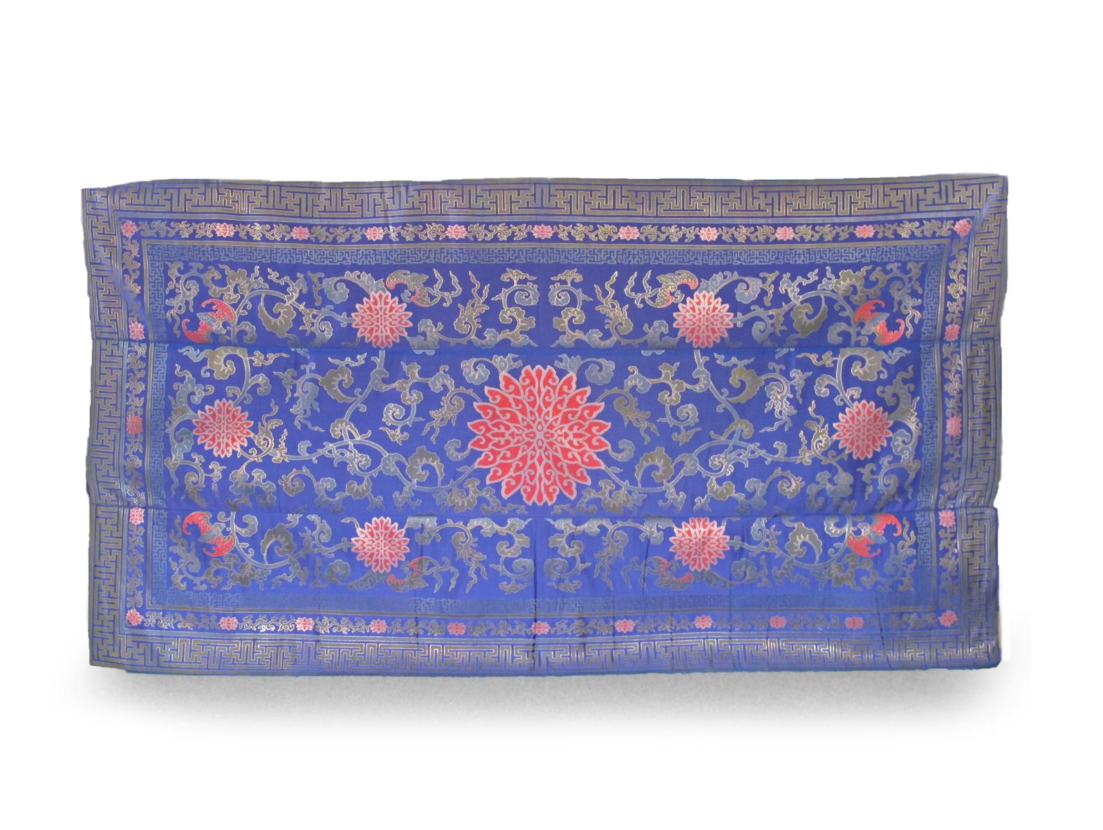 A large and fine Chinese blue ground woven silk panel mid-19th century, constructed in three parts, brightly decorated with a large central spiky flowerhead, and with six smaller growing from scrolling foliage, with bats hidden amidst the leaves, all within formal border designs of complex key fret, further flowers and foliage, the pattern in bright red, pink, and shades of green and gold, 335cm x185cm. Provenance: the Reverend Victor Farmer collection, 1898-1977.