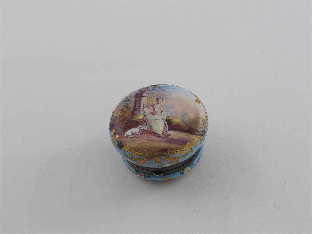 A late 19th century Austro Hungarian enamelled bon bon box, with a hinged cover, painted figures and flowers, heightened by gilding, the interior with painted architectural scenes, by Herman Boehm, Vienna, 2nd half of the 19th century, 2in (5cm) diameter.