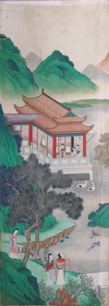 Twelve Chinese wallpaper panels 19th century, depicting a continuous scene of figures and animals in various pursuits amongst mountains and watery scenes, damages and wear, one with a section removed for a socket fitting, each panel approximately 328cm x 118cm each, 14.16m overall width. (12) Provenance: formerly Ashley Manor, King's Somborne, Hampshire.