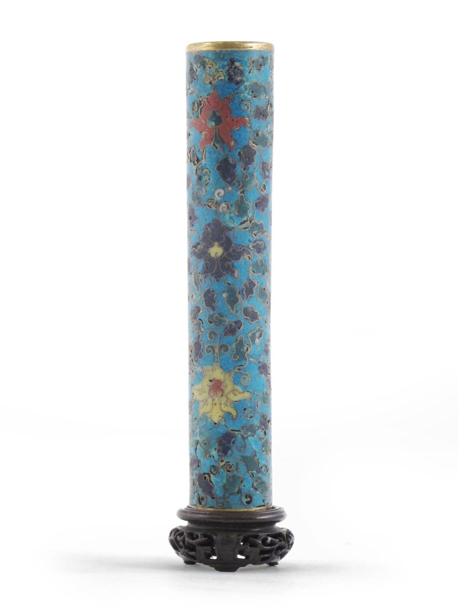 A Chinese cloisonné cylindrical perfumière 17th century, with a scrolling continuous foliate design in yellow, red, white and blue enamels, all on a turquoise ground, together with a reticulated wood stand, some surface damages, 15.3cm. (2)