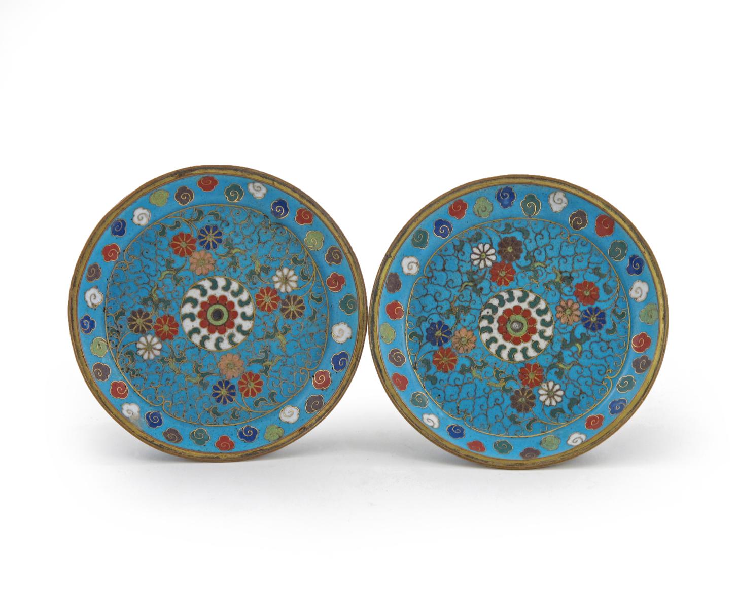 A pair of Chinese cloisonné shallow dishes Qianlong 1736-95, each raised on three short lobed feet, decorated with a band of cloud scrolls encircling a central roundel of flowerheads and scrolling foliage, all on a turquoise ground, the candle spikes lacking, the feet misshapen and repaired, 13.4cm. (2)