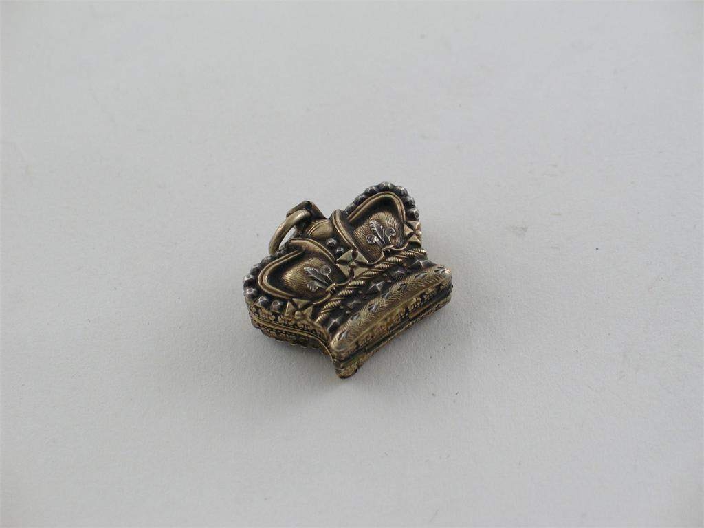 A rare George IV parcelgilt vinaigrette, in the form of the Royal crown, stamped in relief and faceted to simulate jewelling, the grille pierced with a vase of flowers and scrolls, by Joseph Wilmore, Birmingham 1820 (contained in a red Morocco leather case), 1.15in (2.15cm) wide. *Probably made to commemorate the Coronation of King George IV.