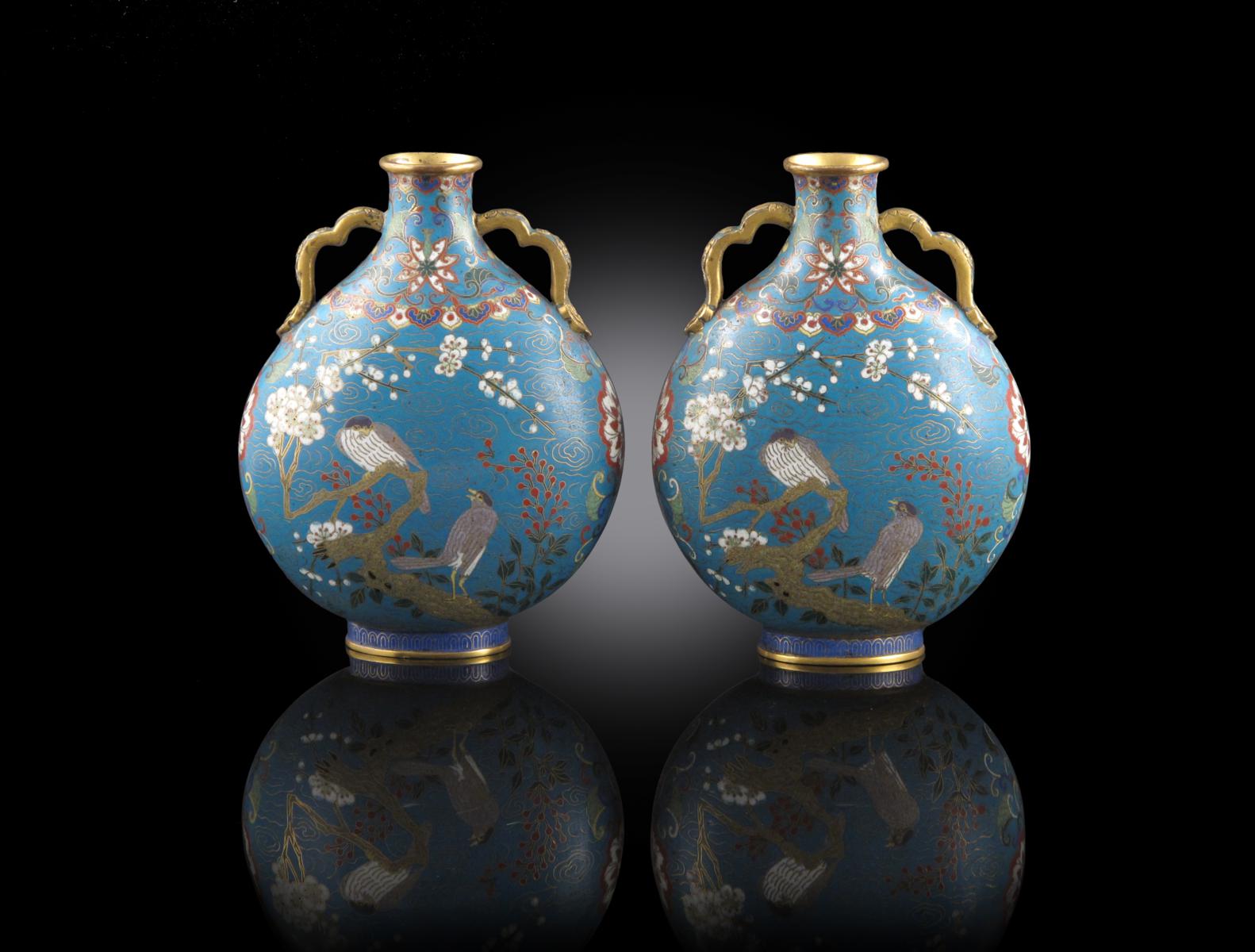 A pair of Chinese gilt bronze and cloisonné moonflasks 19th century, with flattened circular bodies and ruyi-shaped handles, each decorated with a pair of birds to one side and a large peony head to the other, each with a six character Qianlong mark, a little wear to the gilding, 27.2cm. (2) Provenance: formerly in the collection of Muftah Al Abbar, Monaco. Cf. Brown, Chinese Cloisonné: The Clague Collection, pl.12, 21 and 46 for related cloisonné moonflasks.