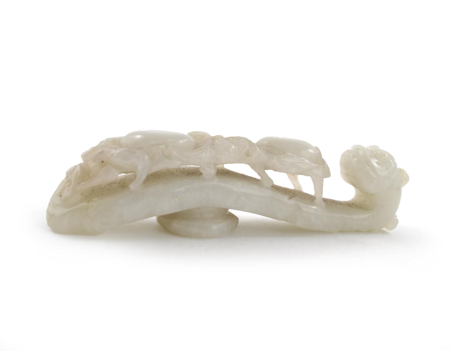 *A Chinese pale celadon jade belthook 18th century, carved in deep relief with two peaches and many lingzhi, the button and hook as ruyi-heads, 9.6cm.