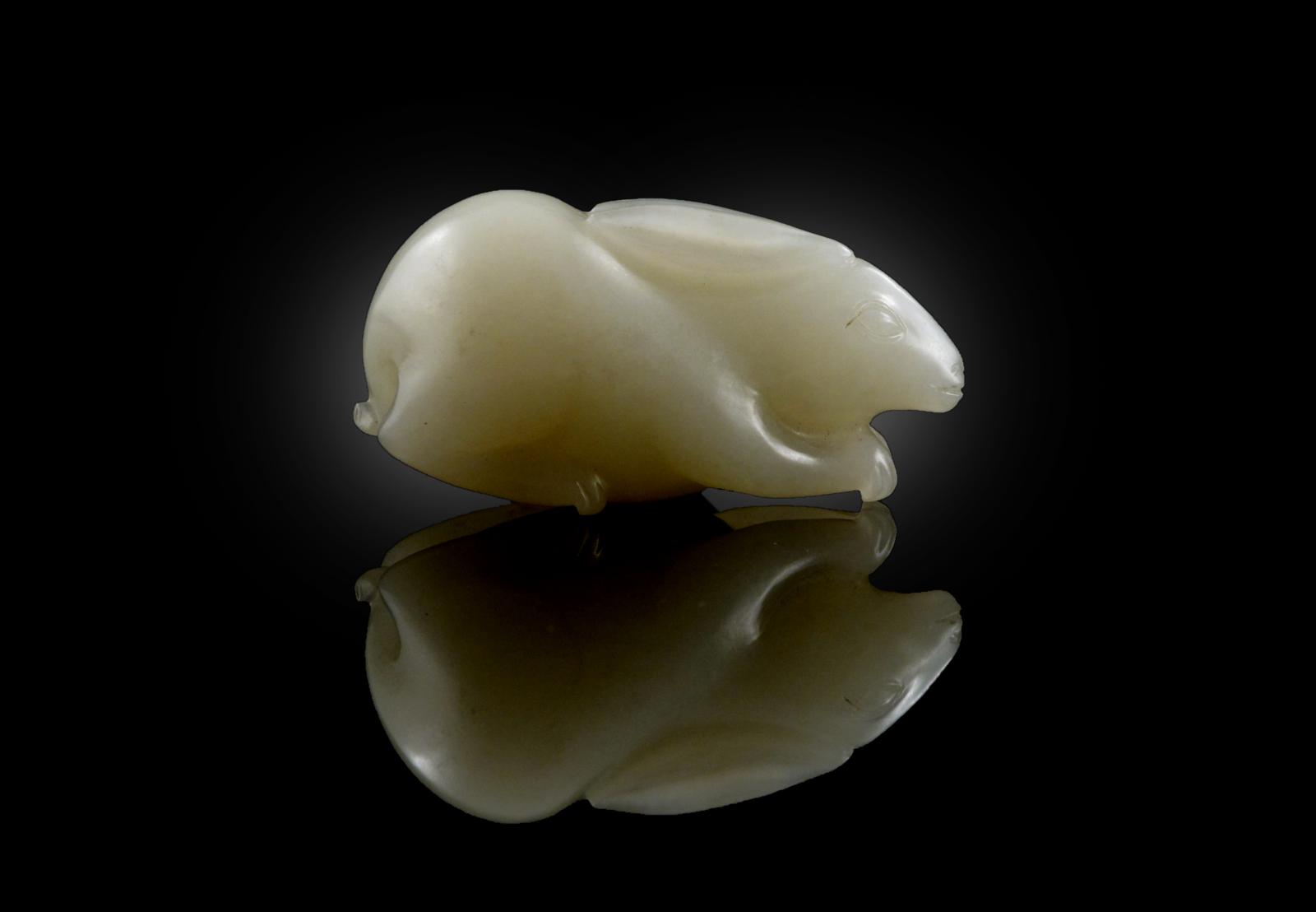 A Chinese pale celadon jade carving of a doe rabbit 18th/19th century, crouching, facing forward with long ears flattened across its back, the stone an even translucent tone, 6.1cm. Provenance: purchased from John Sparks Ltd. in the 1960s.