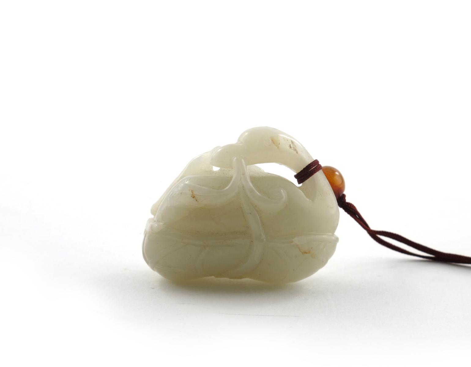 A Chinese celadon jade carving of a goose 18th/19th century, sitting on a lotus leaf and holding a flowering stem in its beak, 5cm.