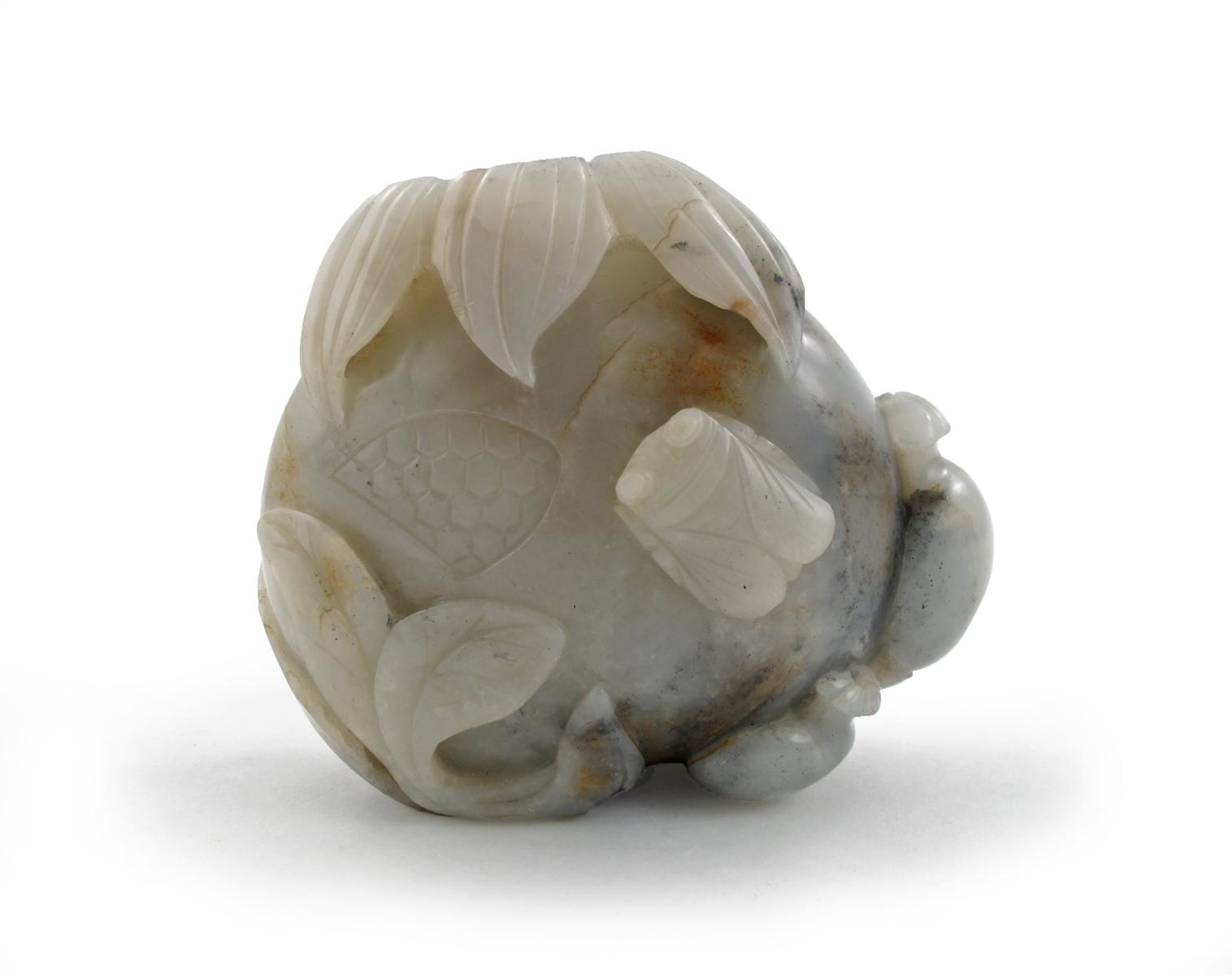 *A Chinese mottled white and grey jade water pot 18th century, carved as a large pomegranate, with leaves to the rim and further fruits issuing from the base, a large cicada to one side, 11.5cm wide.