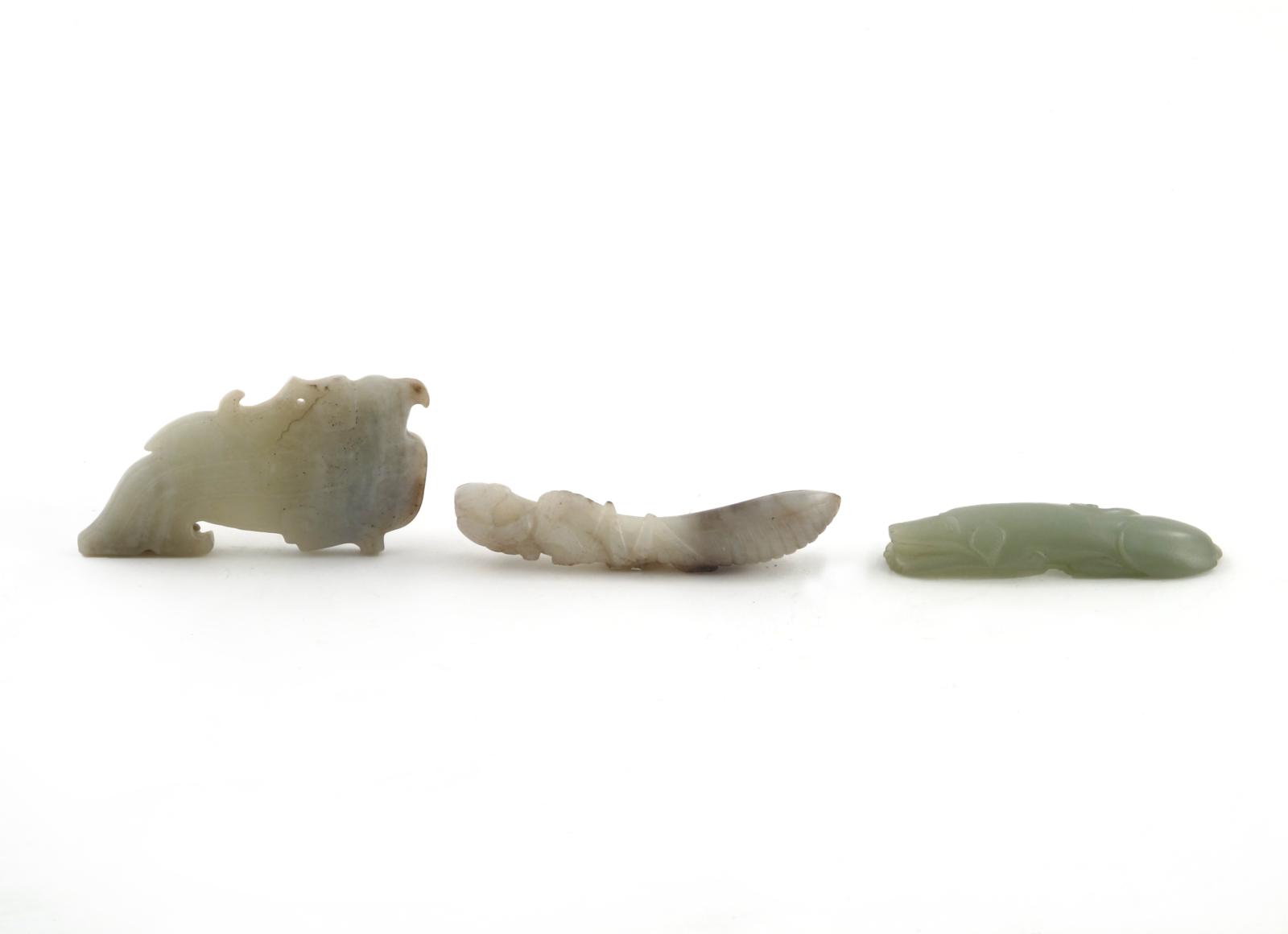A Chinese celadon jade carving of a reclining hound, its paws extended and its tail curved over its back, together with a crouching praying mantis, and a pendant carved as an archaistic bird, the stone with grey and brown variations,7.6cm. (3)