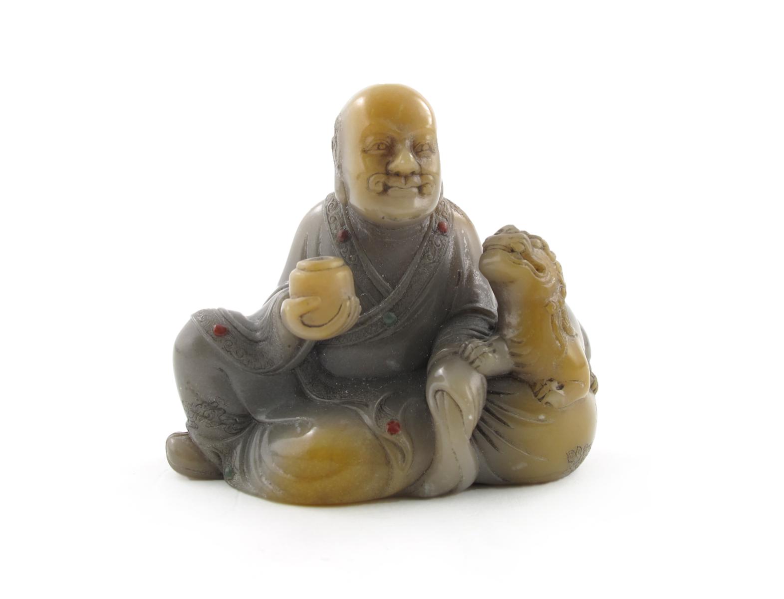 A Chinese soapstone figure of a luohan 18th century, recumbent, holding a begging bowl and with a Buddhist lion dog resting on a sack by his side, the stone inset with precious stones, 7cm.