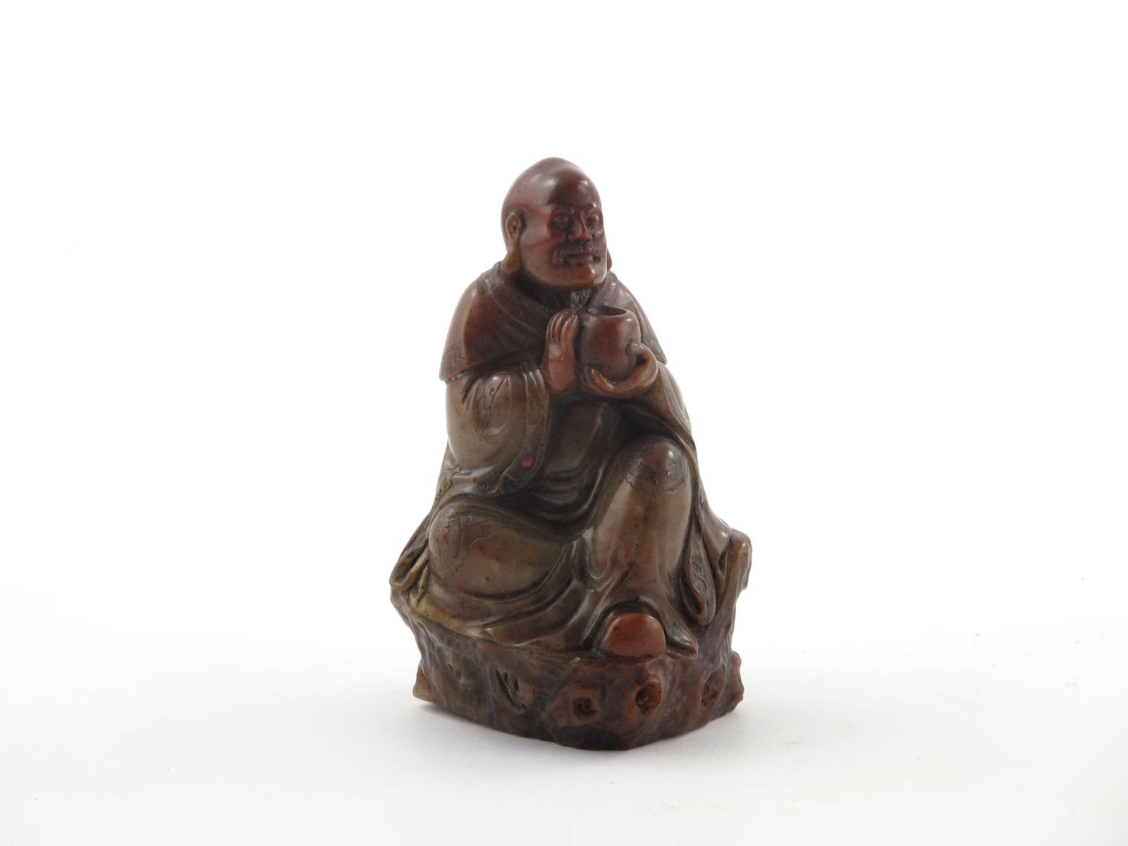 A Chinese soapstone figure of a luohan 19th century, sitting, clutching a begging bowl, his flowing robes inset with semi-precious stones, the base simulating gnarled wood, 14cm.