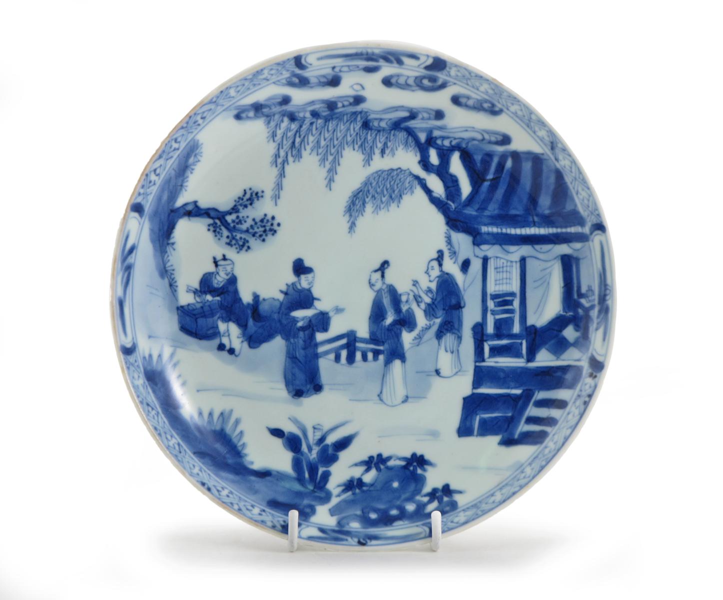 A Chinese blue and white dish six character Yongzheng mark and of the period 1723-35, painted with four figures in a fenced, rocky garden beneath willow and cloud scrolls, the rim with a band of geometric designs, chipping to the rim, 18.4cm.