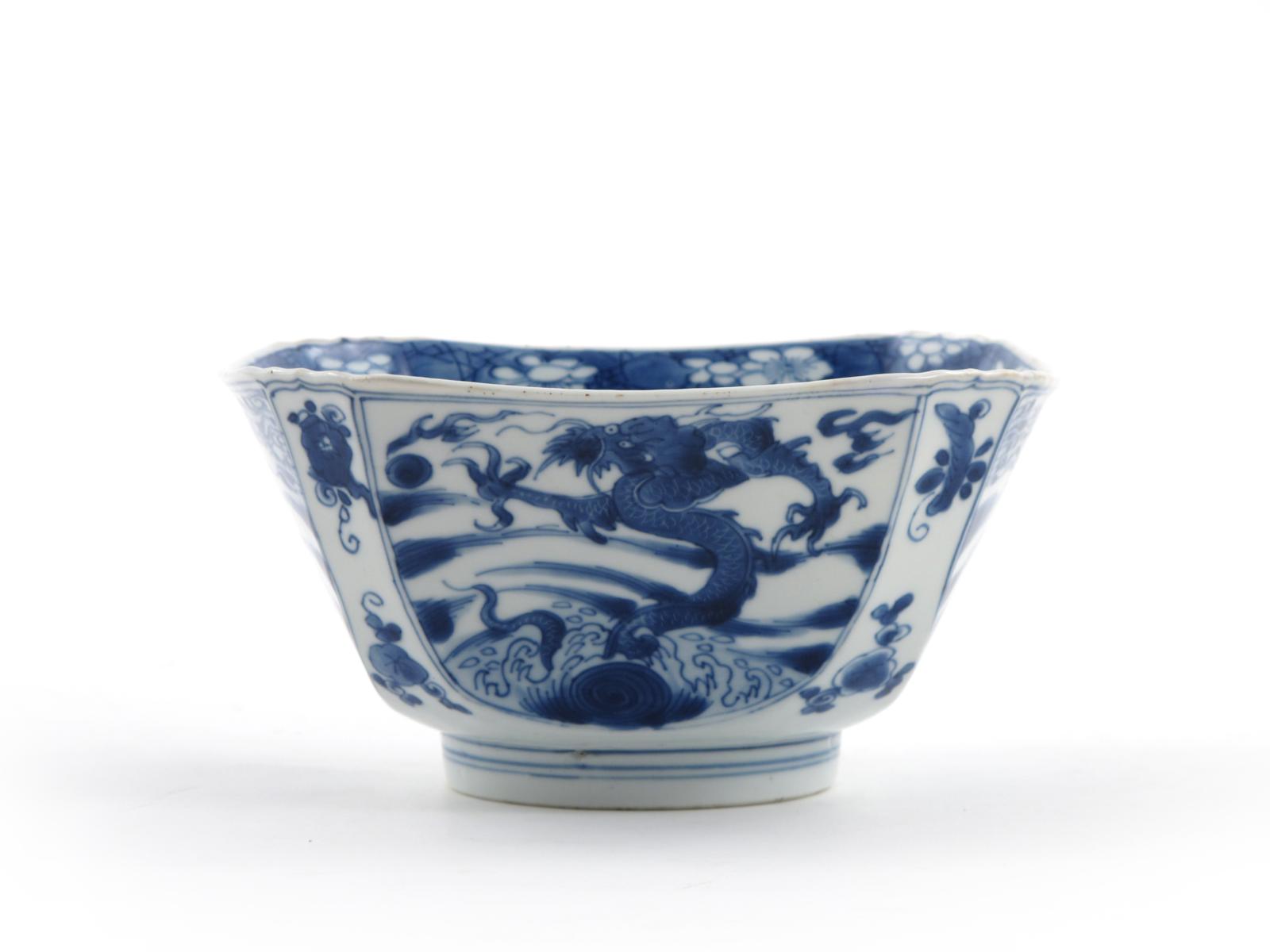 A Chinese blue and white square bowl Kangxi 1662-1722, painted with panels containing dragons and leaping carp, the interior with a further carp and a prunus border, lingzhi mark, 20cm.