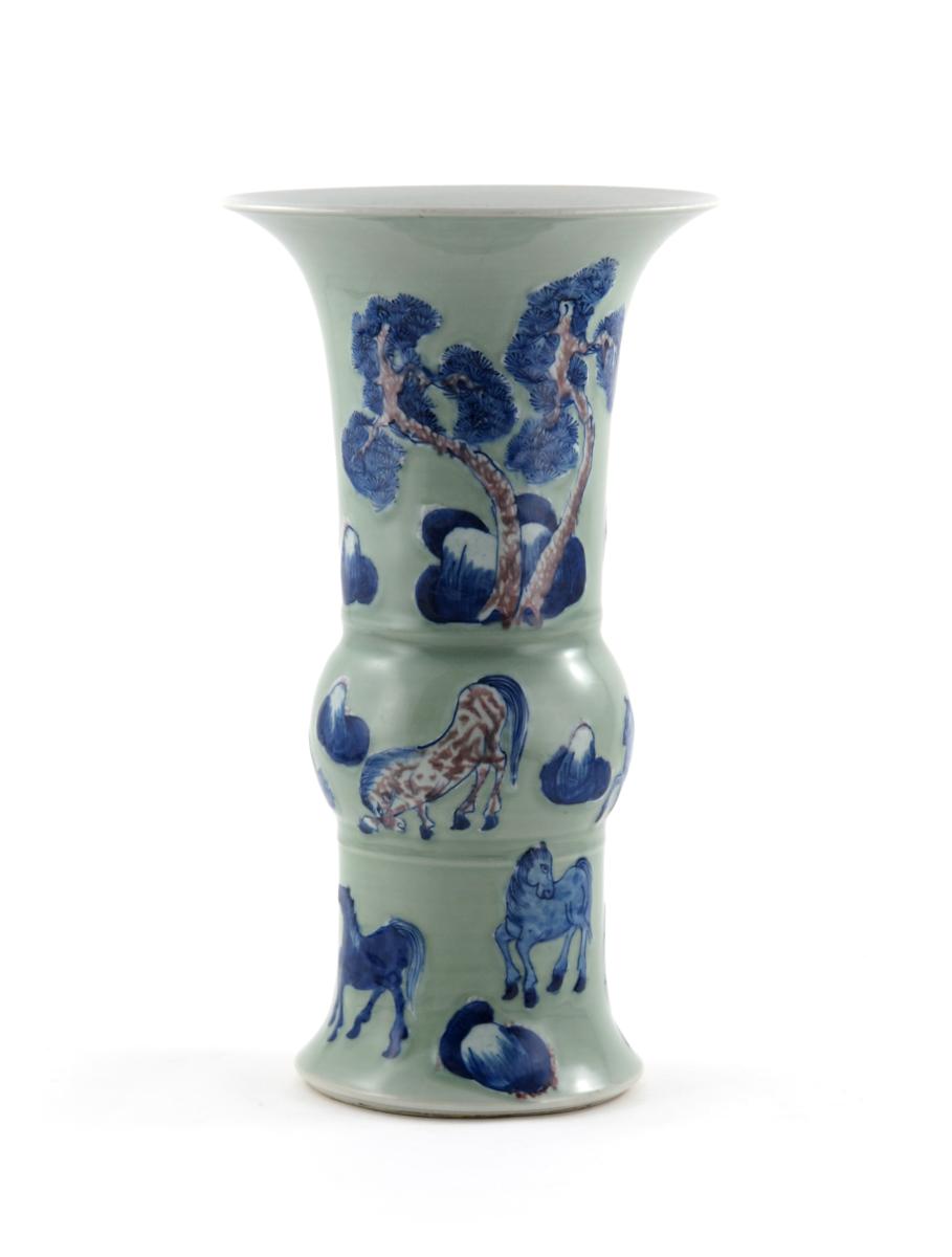 A Chinese celadon ground gu beaker vase 19th century, moulded and painted in underglaze blue and red with the eight horses of Mu Wang amidst pine trees and rocks, 43cm.