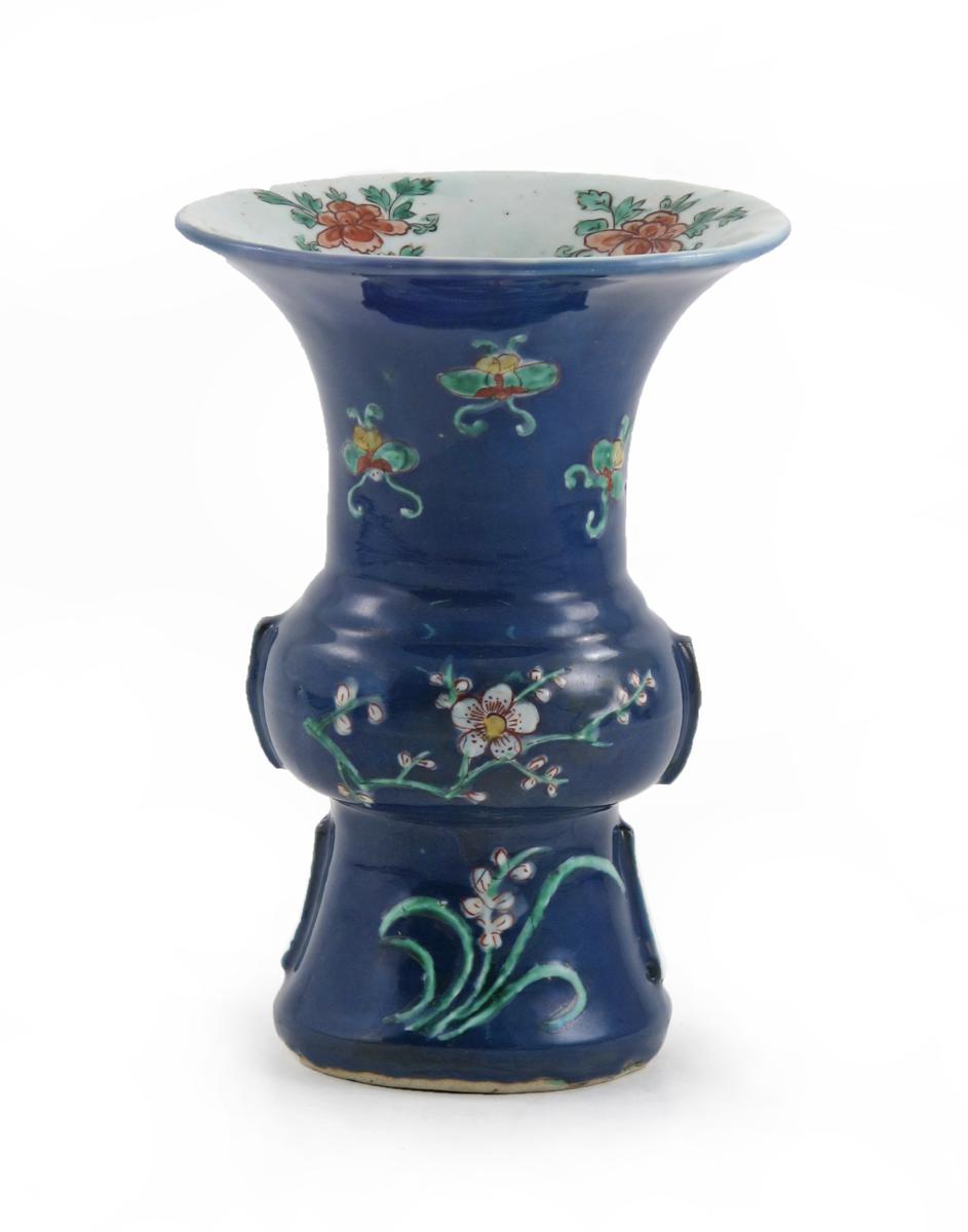 A Chinese blue ground archaistic vase late Ming dynasty, the gu-shaped body moulded with prunus and butterflies, the interior with four flowering peony sprays, 22.2cm.