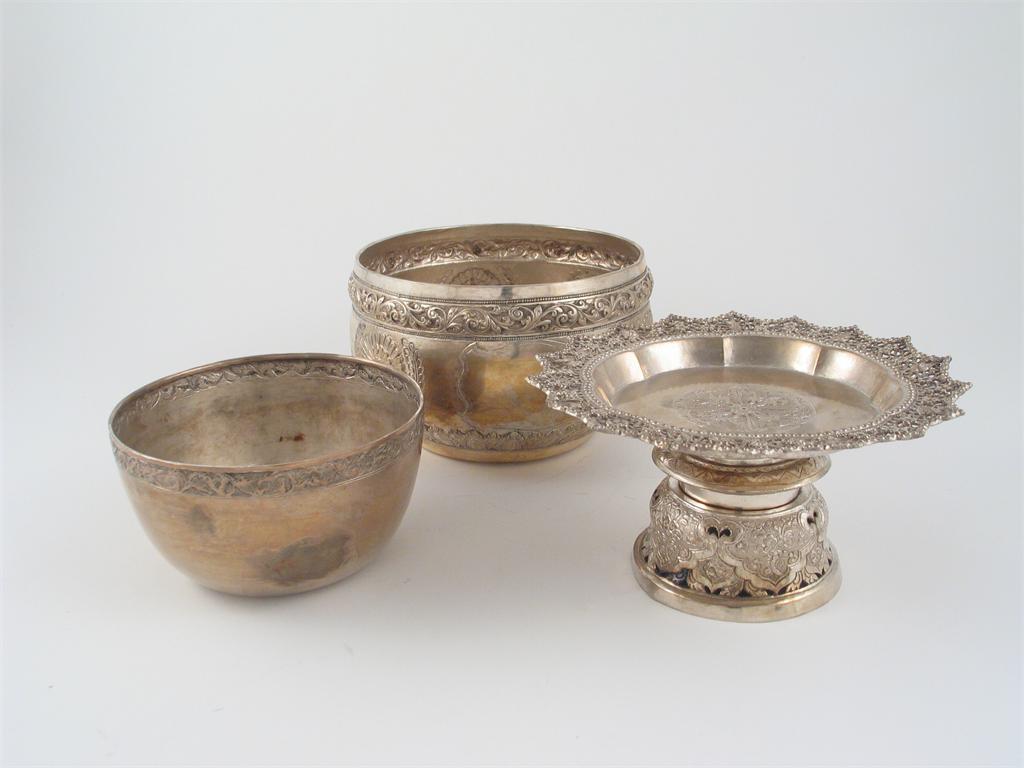 An Eastern tazza, on a chased domed foot, with a pierced border and two plated Burmese rice bowls, the former 6.5in (16.5cm) diameter. (3)