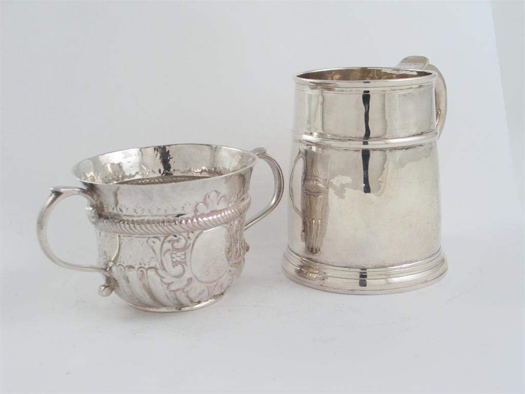 A Queen Anne small tapering mug, with a skirted base and scroll handle, by Nathaniel Lock, London 1712 and a George I small porringer, London 1722 (maker's mark worn), the mug 2.4in (6.2cm) high, 10oz. (2)