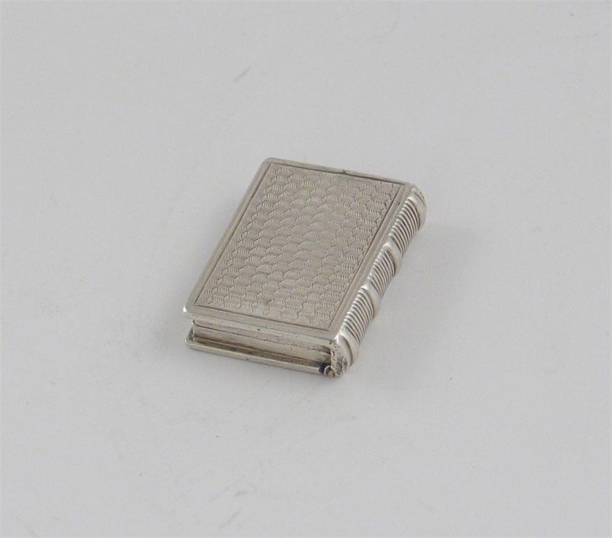 A William IV small book vinaigrette, with engine turned decoration, by Taylor & Perry, Birmingham 1831, 1in (2.6cm) long, 0.3oz.