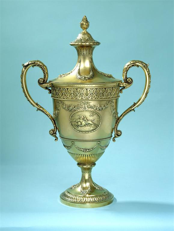 The Doncaster Cup A George III silvergilt, horse racing trophy cup and cover in the Neo Classical manner with chased stiff leaves, fluting and repousee festoons, each side with an applied oval racing medallion below a blind fret frieze of anthemion-like motifs and bell flowers, leaf wrapped scroll handles and borders of beading, inscribed under the foot "Pickett & Rundell, Fecit" and inscribed around the rim "Doncaster Cup 1780" & "The Rt. Honble Lord Viscount Gallway & John Arthur Worsop Esq - Stewards", by Daniel Smith & Robert Sharp, London 1780, 18.5in (47cm) high, overall, 113oz.
