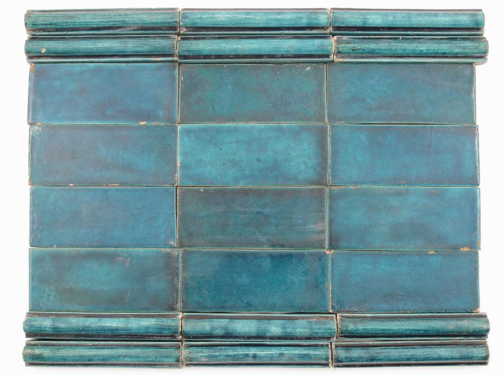 Twenty-four William De Morgan border tiles, rectangular, covered in a turquoise glaze, and fourteen rounded edge tiles glazed turquoise, impressed Merton Abbey and Early Fulham Period marks rectangular tiles 15.5 x 6.5cm.