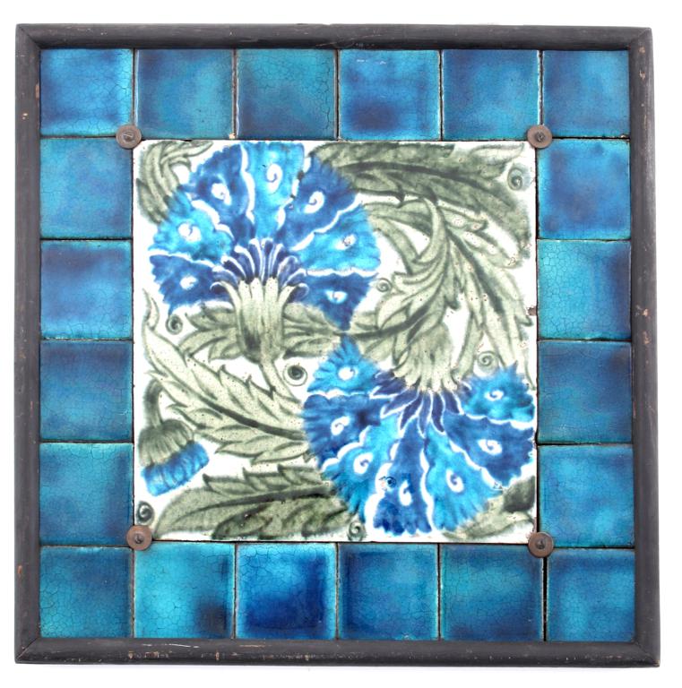 A William De Morgan Double Carnation tile panel, the large central tile painted in shades of blue and green on a white ground, inside blue tile border, framed, central tile 20.5cm. square