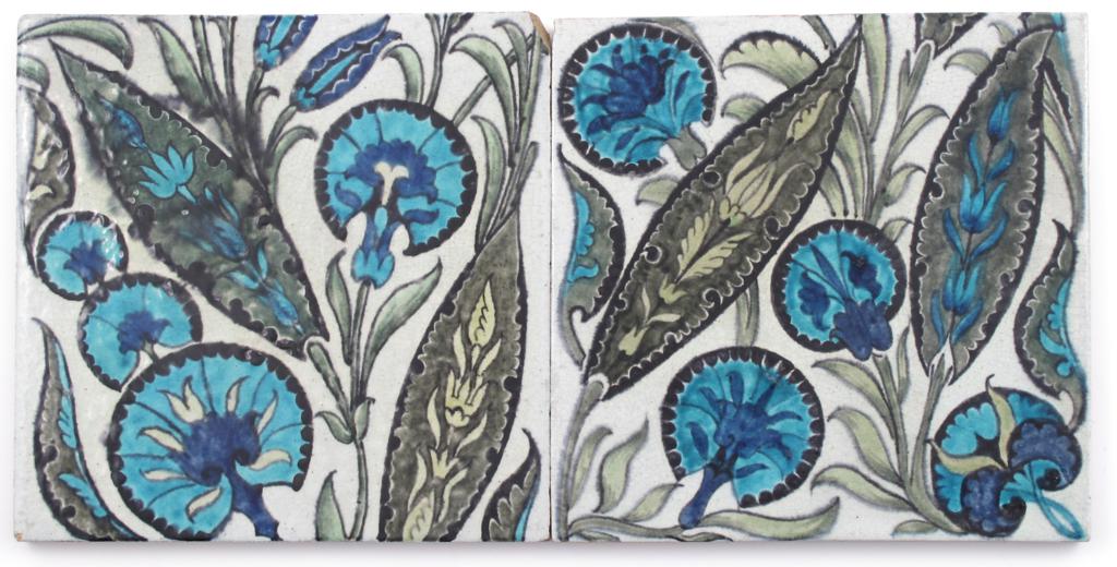 A large William De Morgan Sand's End Pottery two tile repeat panel, painted in shades of green, blue and yellow on a white ground impressed roundel marks 23cm. square