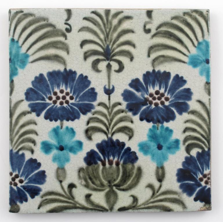 A William De Morgan Sand's End Pottery tile, painted with carnation and segmented leaf design, in shades of blue, turquoise and green on a white ground impressed marks, 15.5cm. square