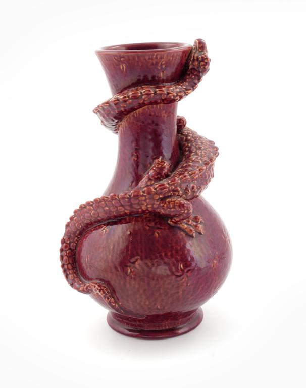 A Burmantofts Faience pottery vase, model no.726, ovoid with waisted neck, modelled with a dragon wrapped around the neck, glazed red impressed marks 31cm. high