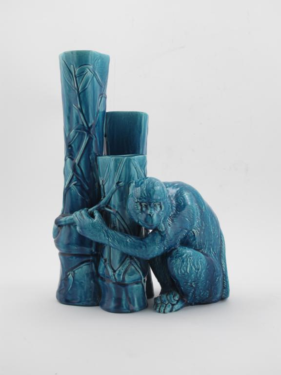 A large Bretby pottery spill vase, modelled as a monkey resting beside three bamboo stems, glazed blue impressed marks 44cm. high
