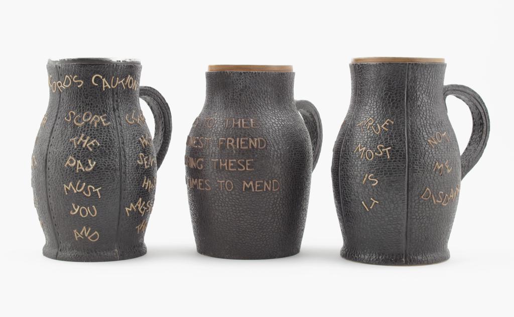 'The Landlords Caution' a Doulton Lambeth stoneware jack, with applied poem, with applied silver rim, and two other Doulton Drinking Jacks impressed marks, 21.5cm. high