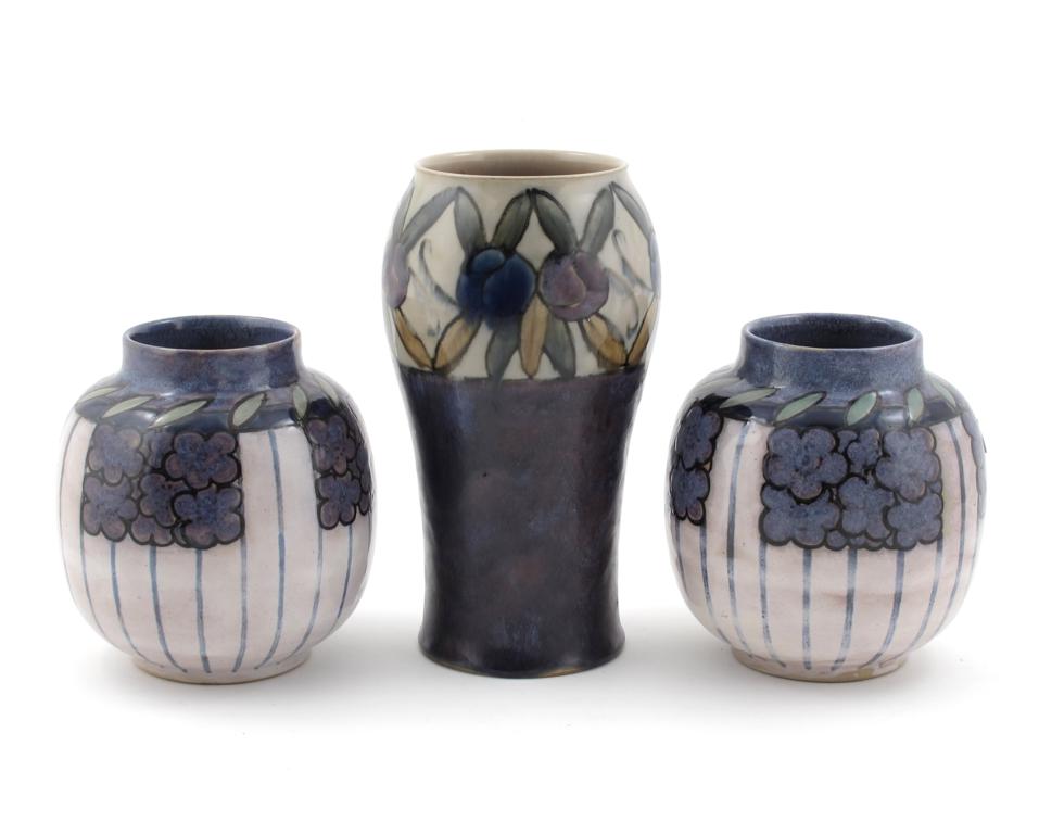 A Pair of Royal Doulton stoneware vases by Annie Lyons, ovoid with collar neck, painted with a band of flowers and foliage, in shades of purple, blue and green on a pale blue ground, and another taller impressed and incised marks, 15.5cm. high