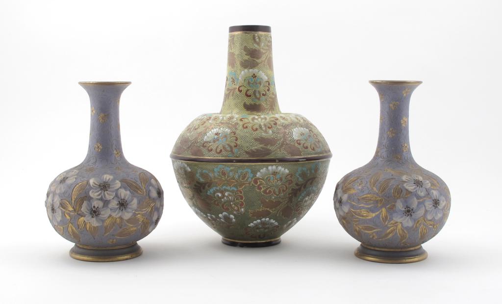 A pair of Doulton Lambeth Silicon Ware stoneware vases by Martha Rogers, slip decorated with blossom sprays in blue, white and brown, highlighted in gilt, and a Doulton Slater's Patent vase impressed marks 21cm. high