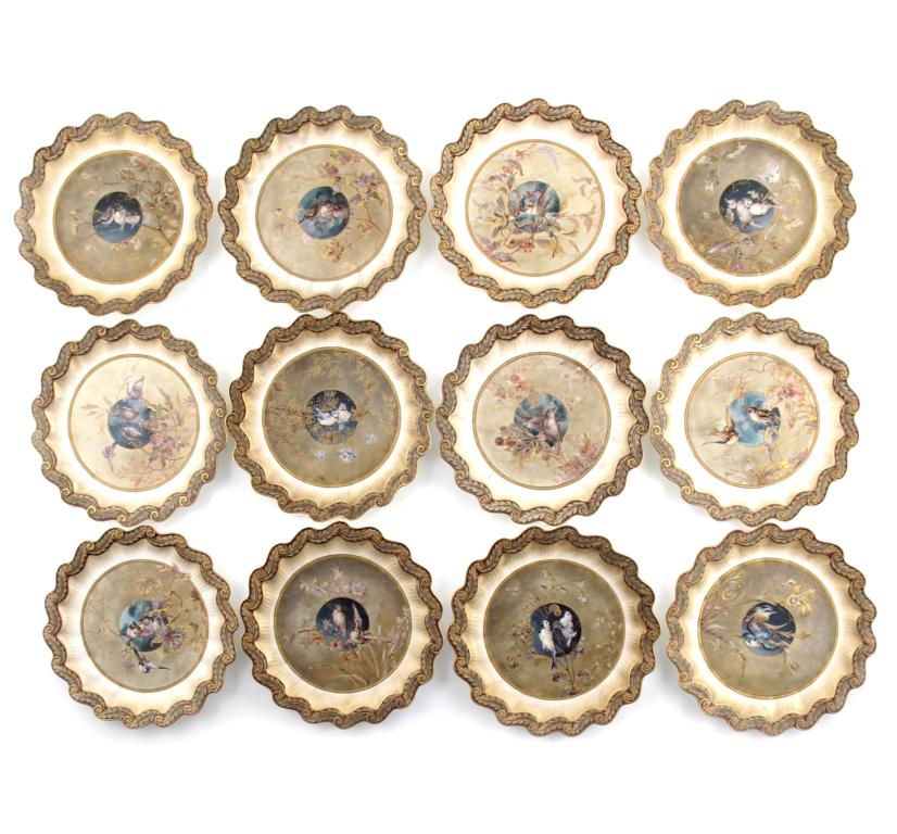 A set of Twelve Doulton Burslem plates, retailed by Phillips, Oxford Street London, each plate with scrolling rim painted with a fern frond repeat, the well decorated with birds perched on tree boughs printed marks, painted artist monogram to reverse 23cm. diam.