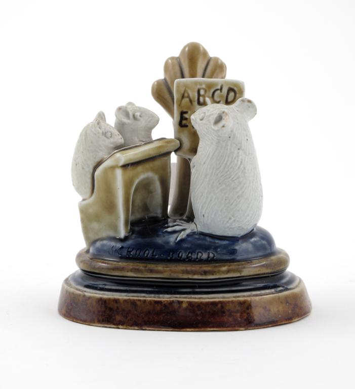 ''School Board' a rare Doulton Lambeth stoneware mouse group menu holder, by George Tinworth, dated 1885, modelled as two young mice learning the alphabet, a teacher pointing to the letters on a board, glazed in colours incised marks, date and GT monogram, small chips to ear and base 9.5cm. high