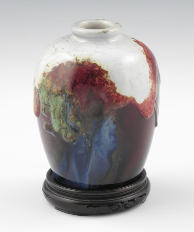 A Royal Doulton Chang stoneware vase by Charles Noke and Harry Nixon, shouldered form with collar rim, covered in a thick, running volcanic glaze in shades of yellow, green, flambe and crackled white over a streaked blue and flambe ground, with ebonised wood stand printed mark, painted signature and monogram 19.5cm. high (total) vase 16.5cm.
