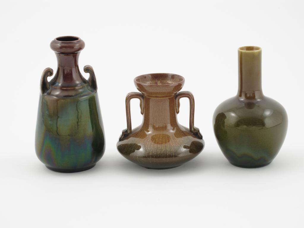 A Linthorpe Pottery vase designed by Dr Christopher Dresser, model no.958, compressed body with cylindrical neck and applied angled handles, covered in a streaked ochre and green glaze, and two other vases impressed marks, 9cm. high