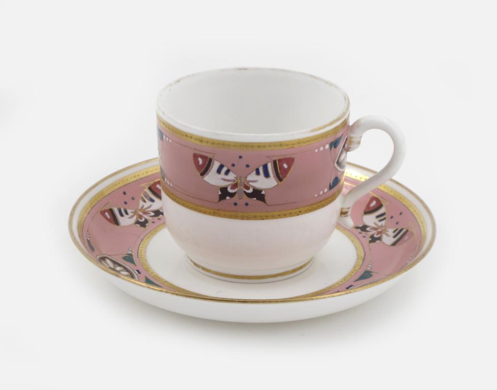 A Minton's porcelain Cloisonne cup and saucer designed by Dr Christopher Dresser