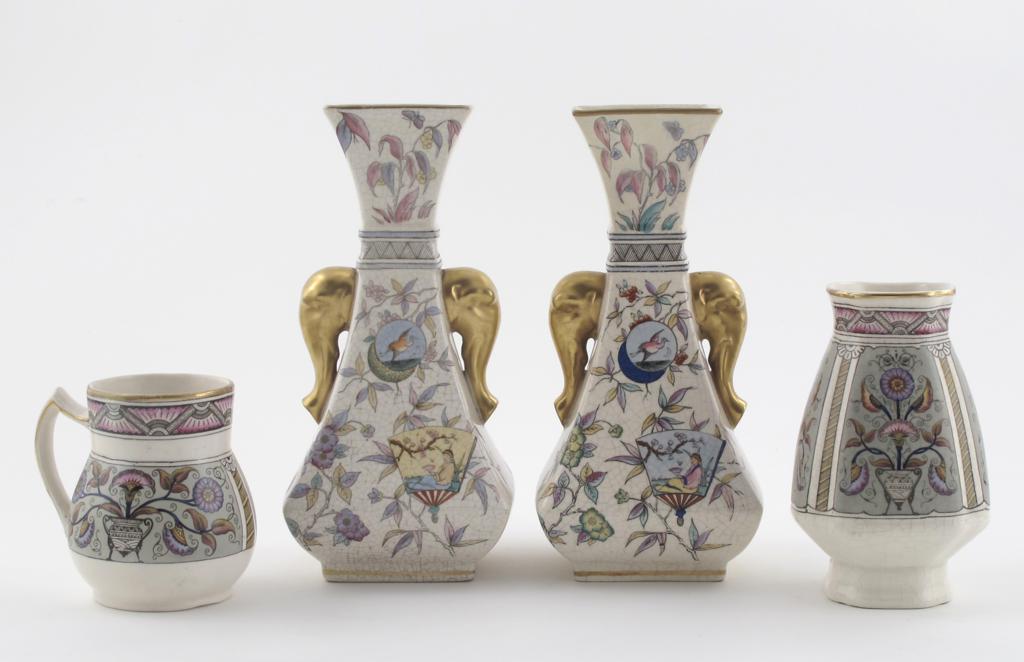 A pair of Old Hall vases the design attributed to Dr Christopher Dresser, tapering, waisted square section body with flaring neck applied with elephant mask handles, printed with flying crane mon amidst fan panels and foliage sprays, and two Old Hall Eureka pattern vases printed marks, damages 23cm. high